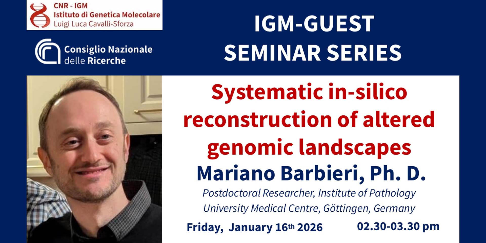 Venerdì 16 gennaio 2026, alle ore 14:30, si terrà presso l'Istituto di Genetica Molecolare "Luigi Luca Cavalli-Sforza" del CNR, il seminario “Systematic in-silico reconstruction of altered genomic landscapes in cancer”.