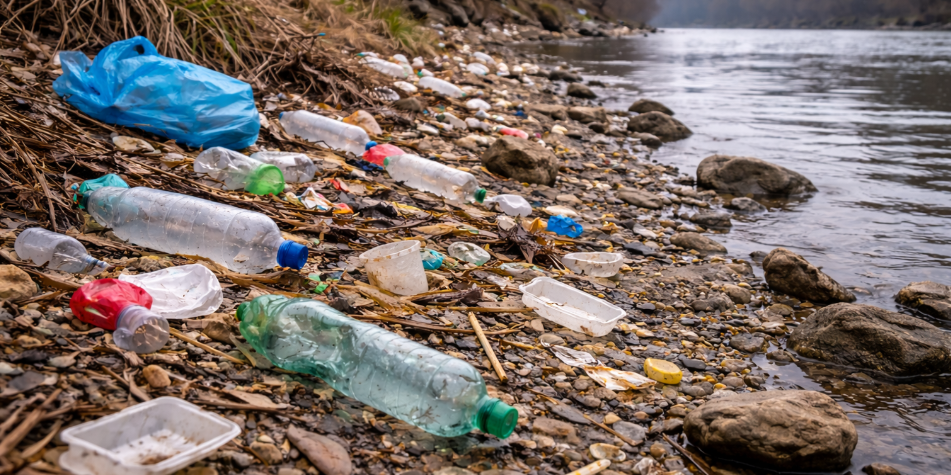 Riva di un fiume con rifiuti plastici