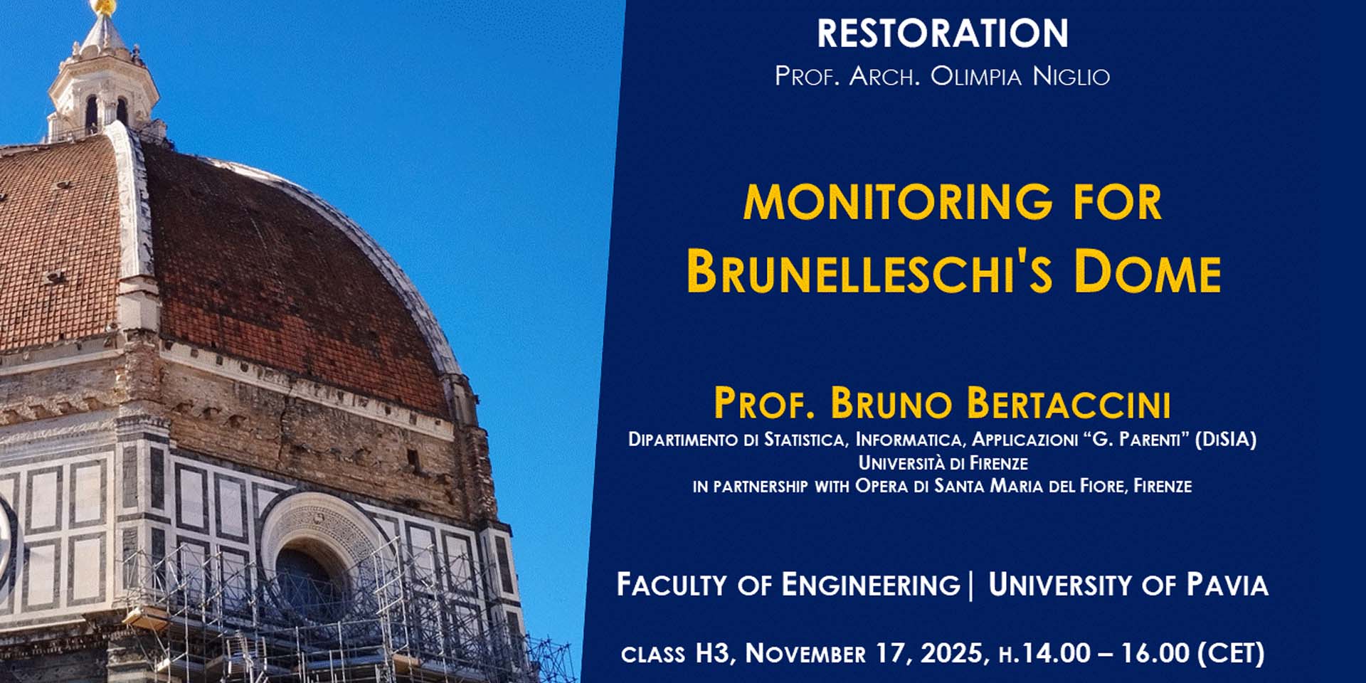 Il 17 novembre 2025 il corso di Restauro Architettonico (Restoration) dell’Università di Pavia ospiterà la lezione del professore Bruno Bertaccini del Dipartimento di Statistica, Informatica, Applicazioni “G. Parenti” (DiSIA) dell’Università di Firenze per condividere il progetto per il nuovo sistema di monitoraggio della Cupola della Cattedrale di Santa Maria del Fiore a Firenze.