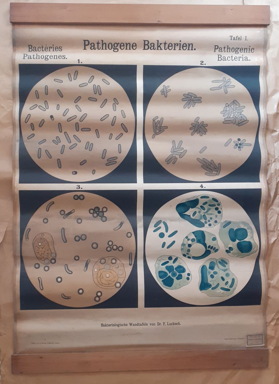 Sarà l’occasione per presentare al pubblico una tappa importante per la valorizzazione del suo patrimonio. Sono infatti state recuperate dai magazzini della struttura una ventina di tavole didattiche parietali cartacee di inizio Novecento, utilizzate nell’insegnamento di batteriologia e microbiologia. Si trattava di discipline nascenti che a partire dell’ultimo quarto del XIX secolo avevano aperto grandi speranze nel campo dalla salute pubblica e della lotta alle malattie infettive. Finalmente molti ‘nemici invisibili’ potevano essere identificati. Era un traguardo entusiasmante in un campo di studi che vedeva in prima linea anche il laboratorio diretto da Camillo Golgi.