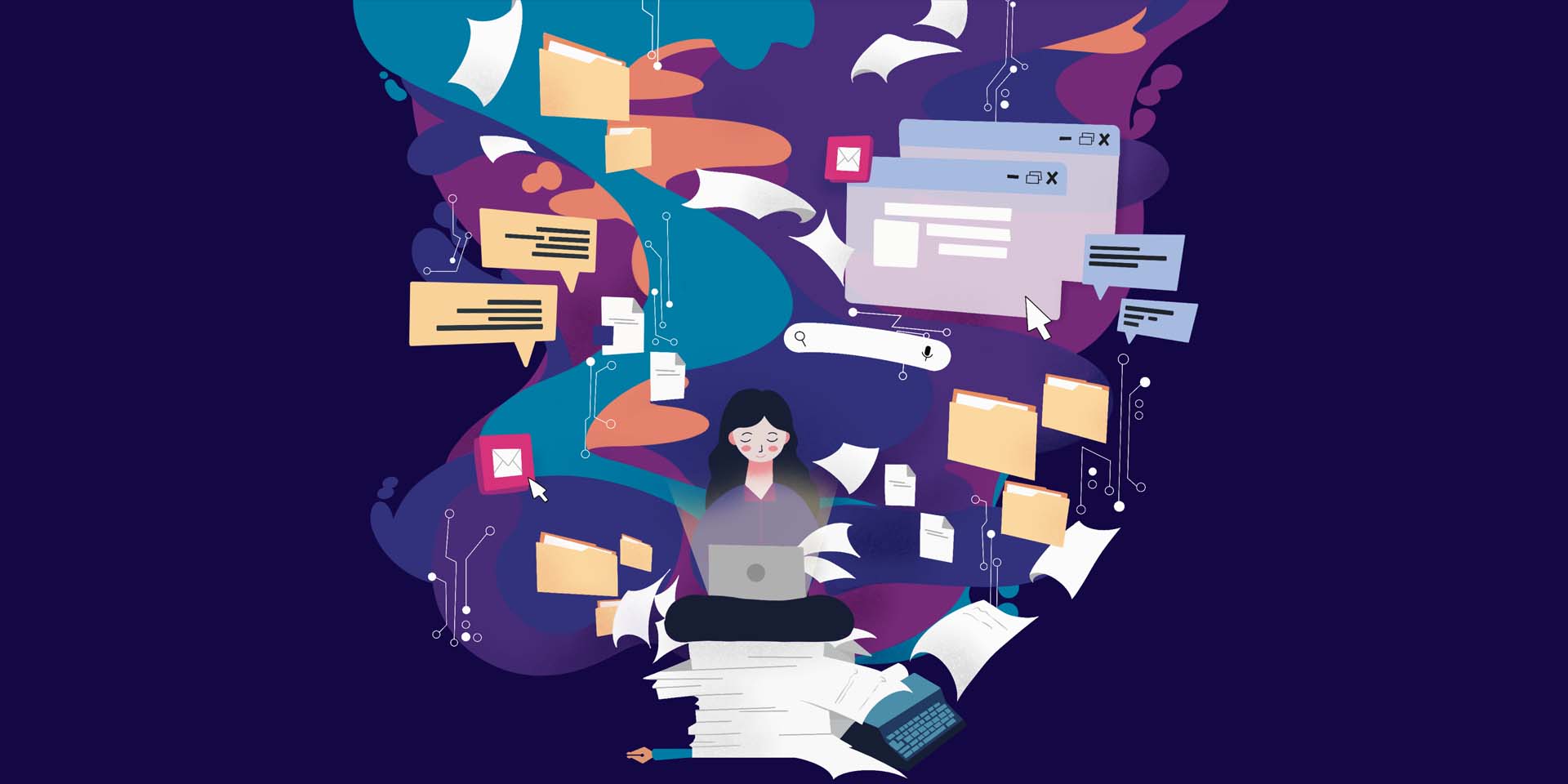 Disegno raffigurante ragazza al computer seduta su pila di fogli e circondata da file, cartelle e schermate telematiche
