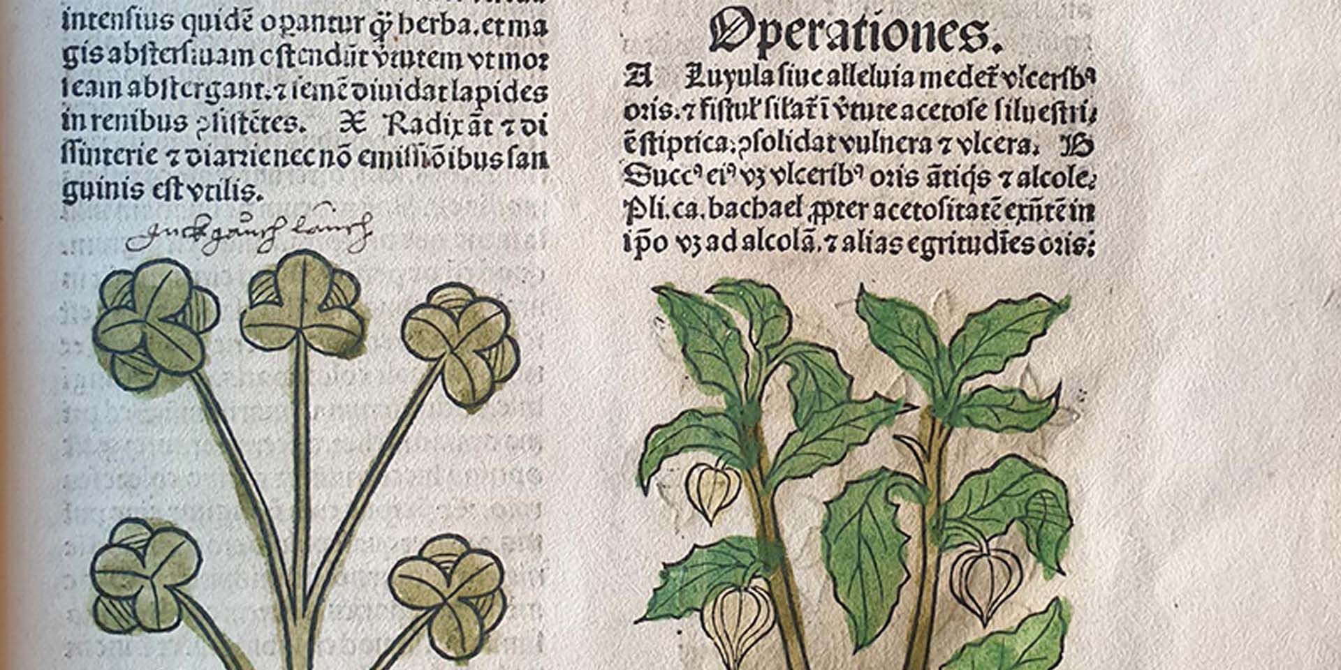 Due pagine dell'antico incunabolo dell’erbario "Hortus sanitatis" di Johannes de Cuba (Johann von Wonnecke Caub; 1430-1503) conservato presso la Biblioteca Universitaria di Pavia.