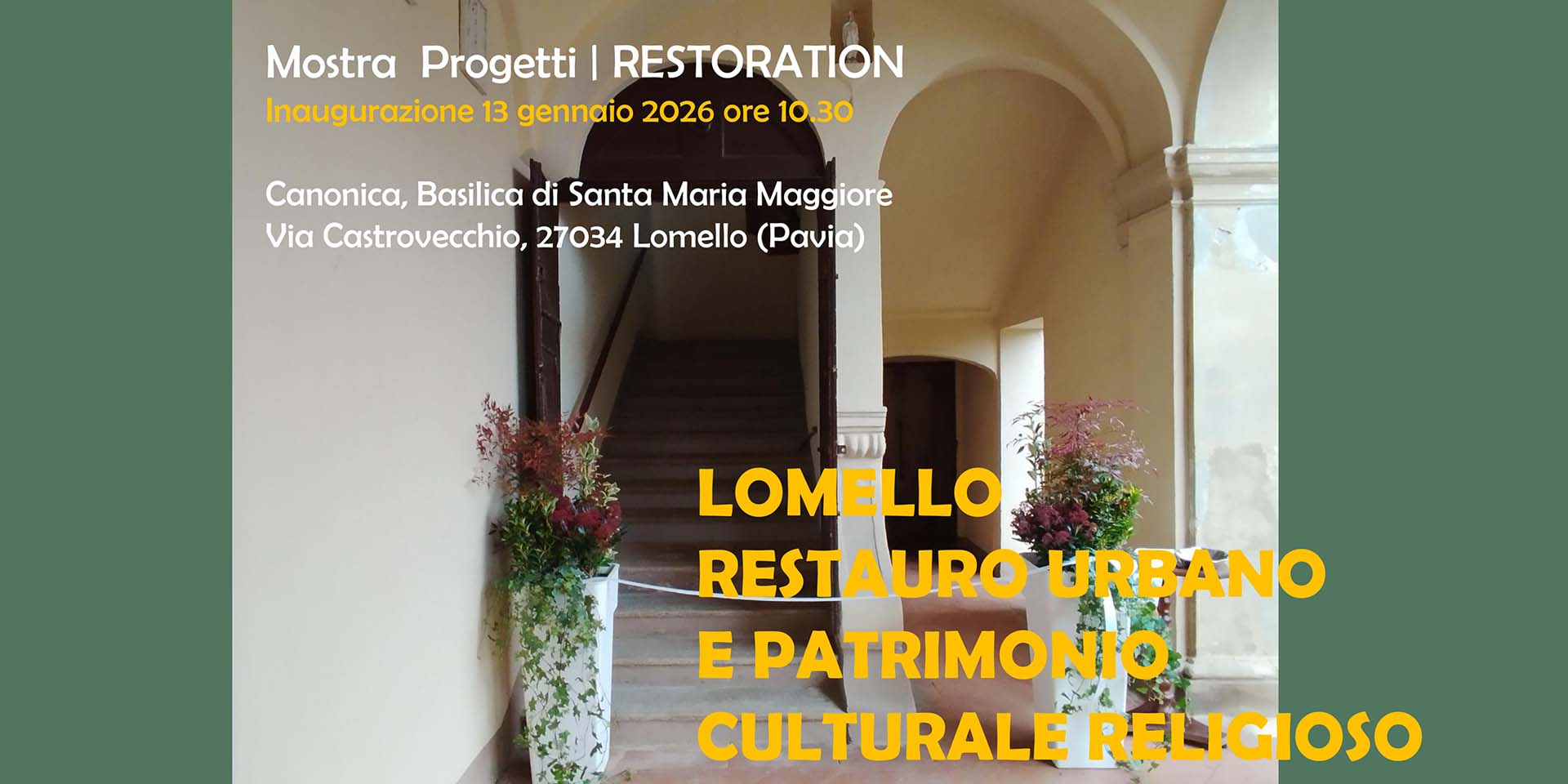 Martedì 13 gennaio 2026 presso la Canonica della Basilica di Santa Maria Maggiore a Lomello sarà inaugurata la mostra “Lomello Restauro Urbano e Patrimonio Culturale Religioso”. La mostra è il risultato dei lavori del corso di Restauro Architettonico (Restoration) dell’A.A. 2025-2026.
