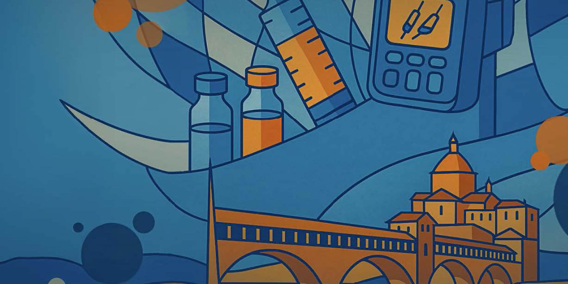 Disegno stilizzato del Ponte Coperto di Pavia, sullo sfondo provette mediche