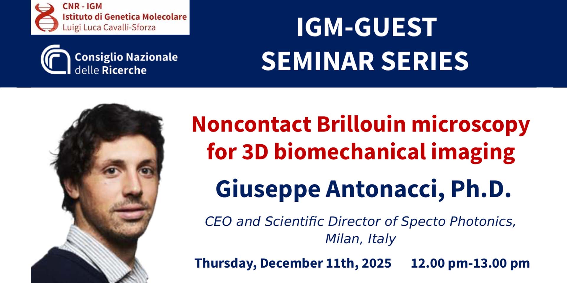 Giovedì 11 dicembre 2025, alle ore 12:00, si terrà presso l'Istituto di Genetica Molecolare "Luigi Luca Cavalli-Sforza" del CNR il seminario “Noncontact Brillouin microscopy for 3D biomechanical imaging”.