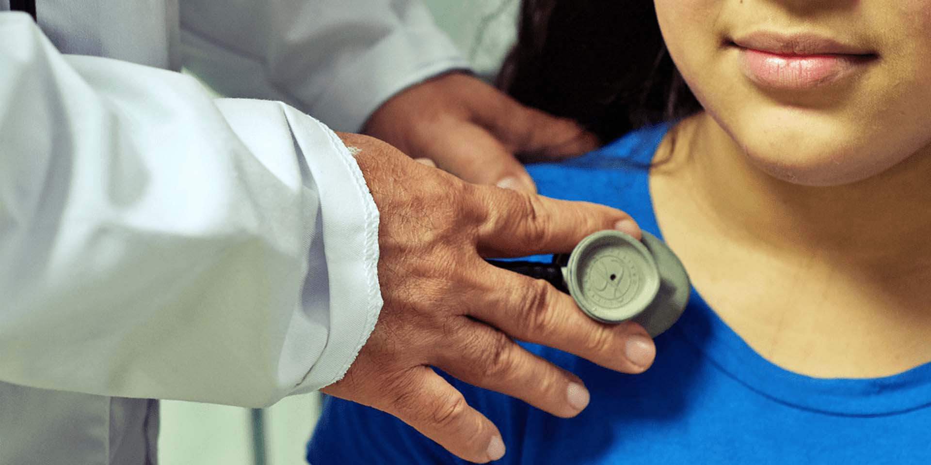 Pediatra che visita bambina con stetoscopio, dettaglio