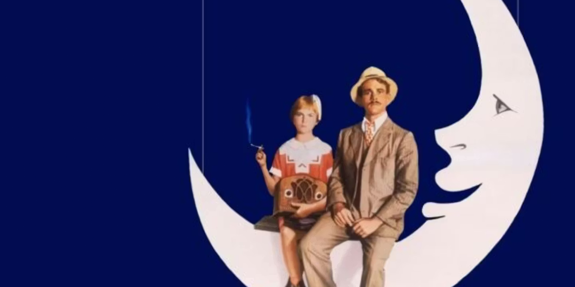 I due protagonisti del film "Luna di carta" seduti sulla sagoma di una luna di cartone