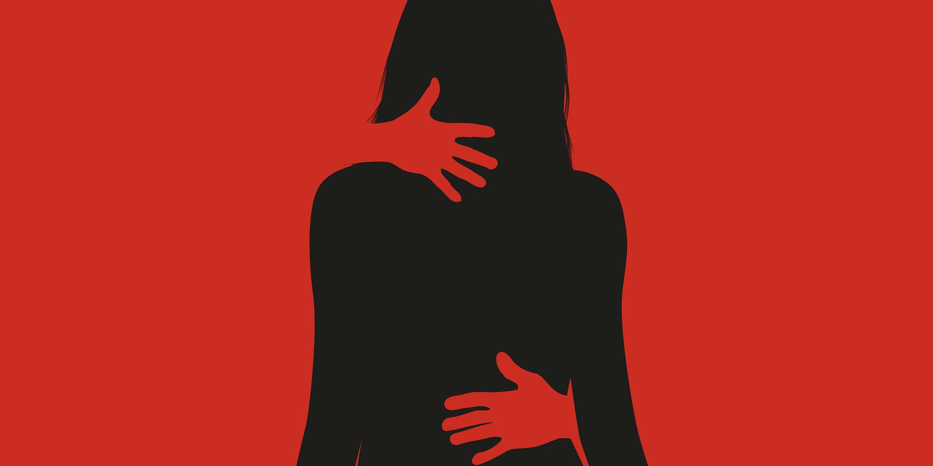 Sagoma di donna in nero su fondo rosso dal quale emergono due mani che toccano la donna