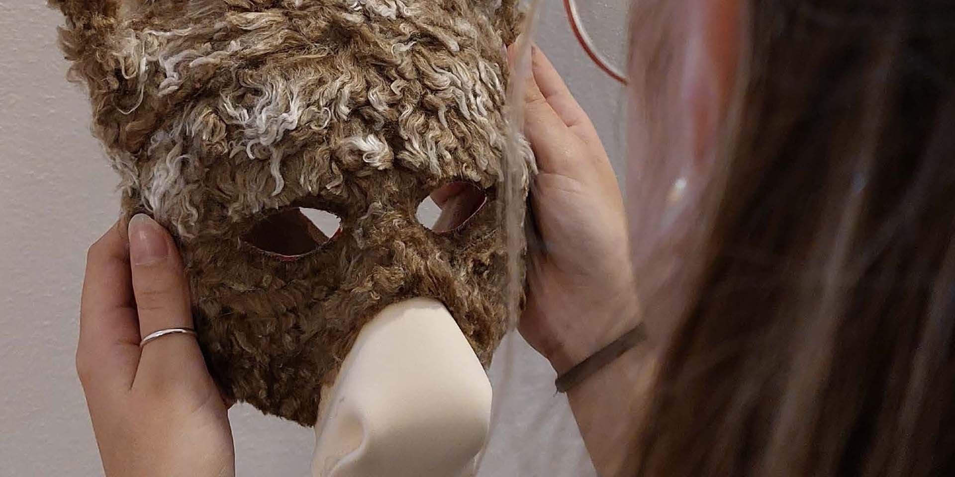 Ragazza di spalle tiene in mano maschera di un asino