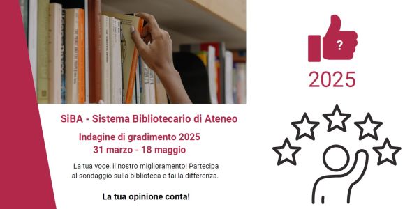 Fino al 18 maggio 2025 è possibile partecipare all'indagine promossa dal Sistema Bibliotecario di Ateneo per acquisire valutazioni e opinioni su strutture, servizi e personale. |