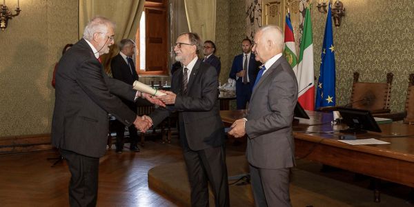 Il Rettore prof. Francesco Svelto, come da da tradizione, ha consegnato personalmente la Medaglia ai docenti ordinari di nuova nomina dell'Università di Pavia. |