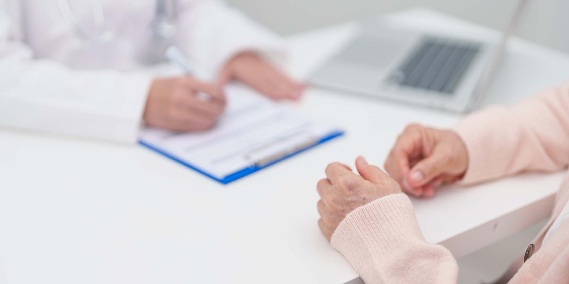 Dettaglio su scrivania a cui siedono paziente e medico che scrive su una cartelletta