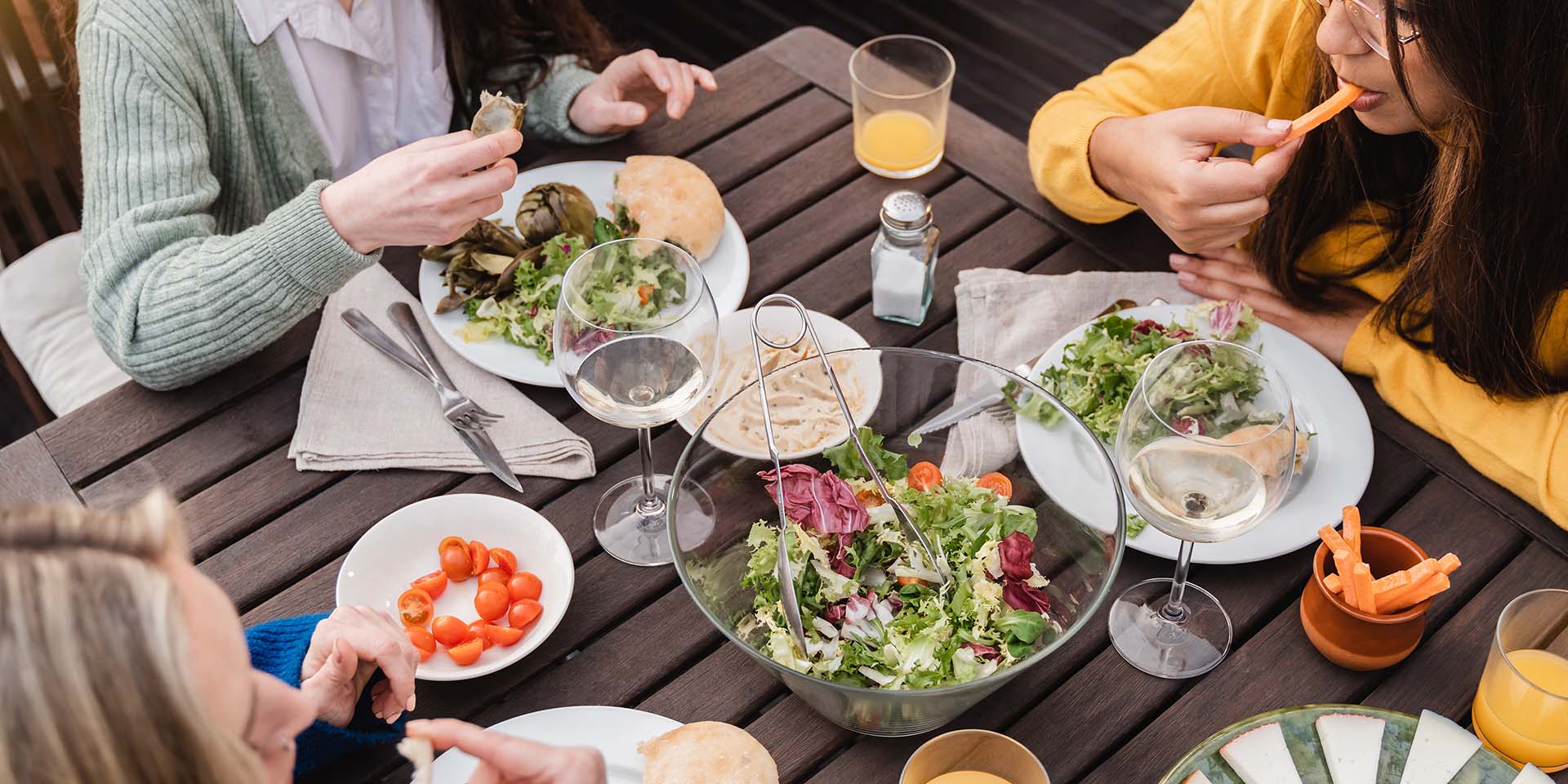 Tre ragazze sedute a un tavolo che mangiano cibo sano: verdure, pane, ecc.
